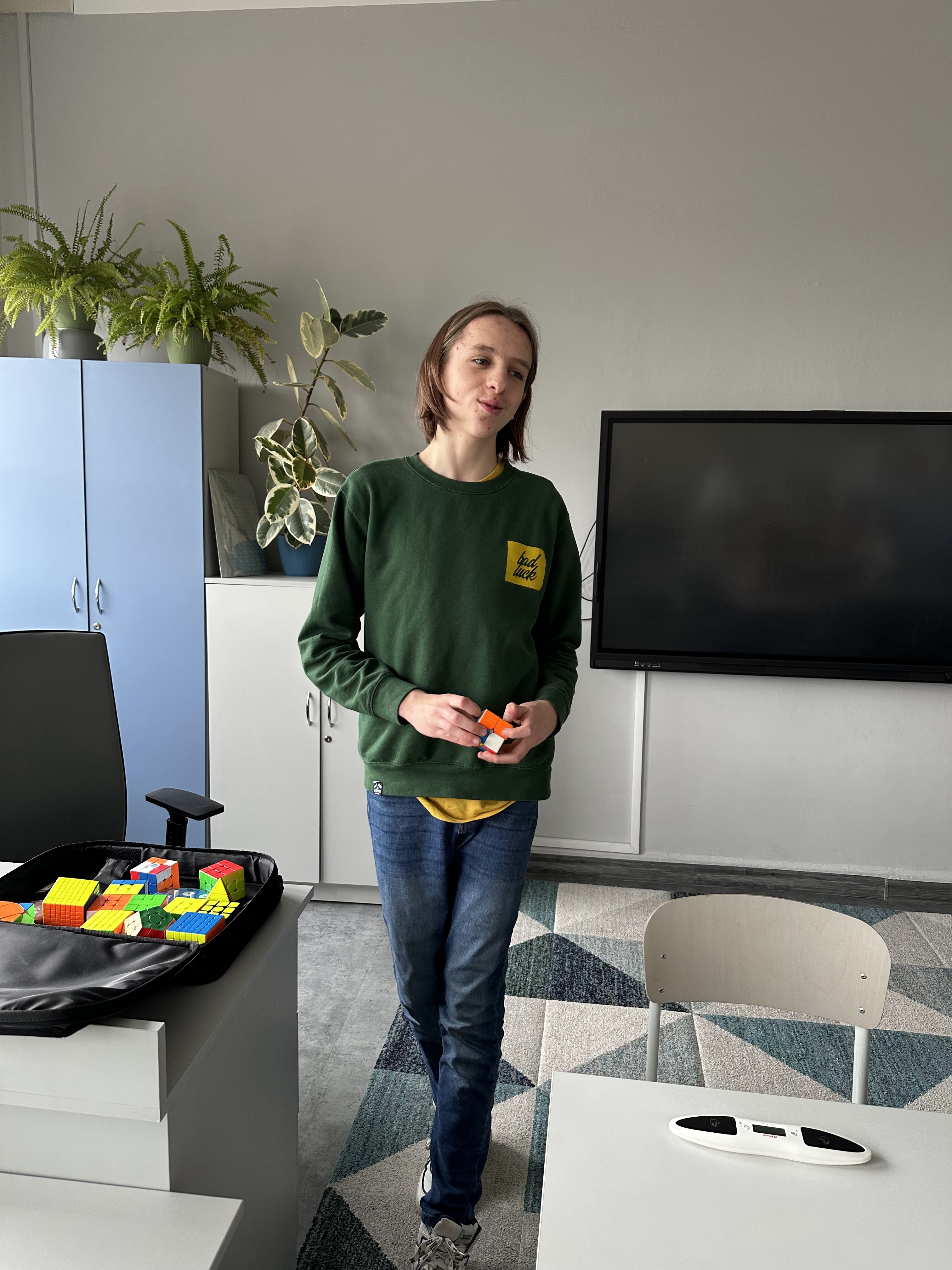 Jędrek nie tylko zaprezentował swoje niesamowite umiejętności, ale także opowiedział o swojej pasji, pierwszych krokach w świecie kostek Rubika i codziennych treningach, które pozwalają mu osiągać tak imponujące rezultaty. Uczniowie z zaciekawieniem słuchali, zadawali pytania i z niedowierzaniem obserwowali kolejne rekordowe układania.
