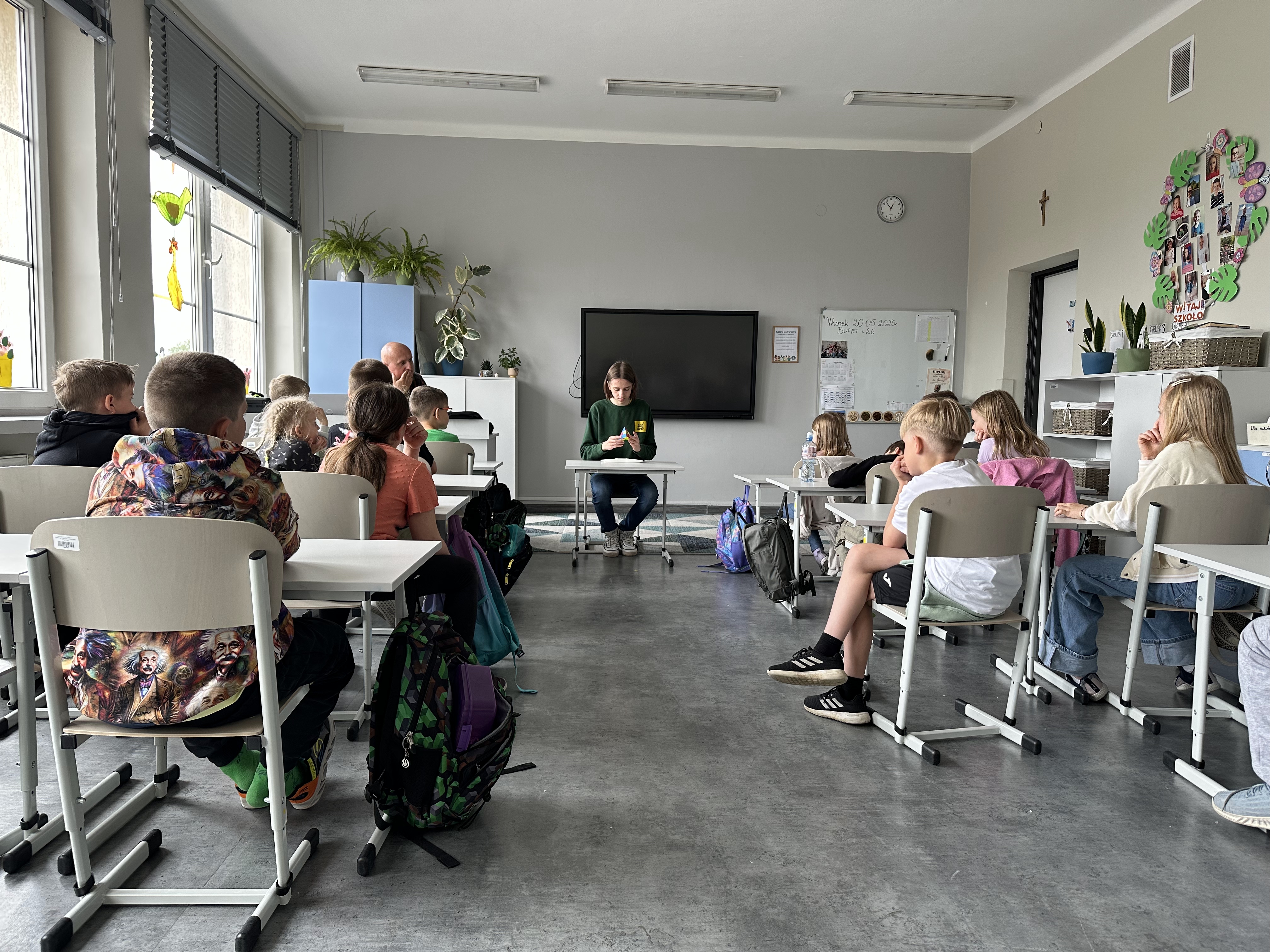 Dla wielu dzieci była to nie tylko ciekawa lekcja o logicznym myśleniu, cierpliwości i koncentracji, ale także inspiracja do rozwijania własnych pasji. Na zakończenie spotkania chętni uczniowie mogli spróbować swoich sił w układaniu kostki – pod okiem mistrza i z jego cennymi wskazówkami.