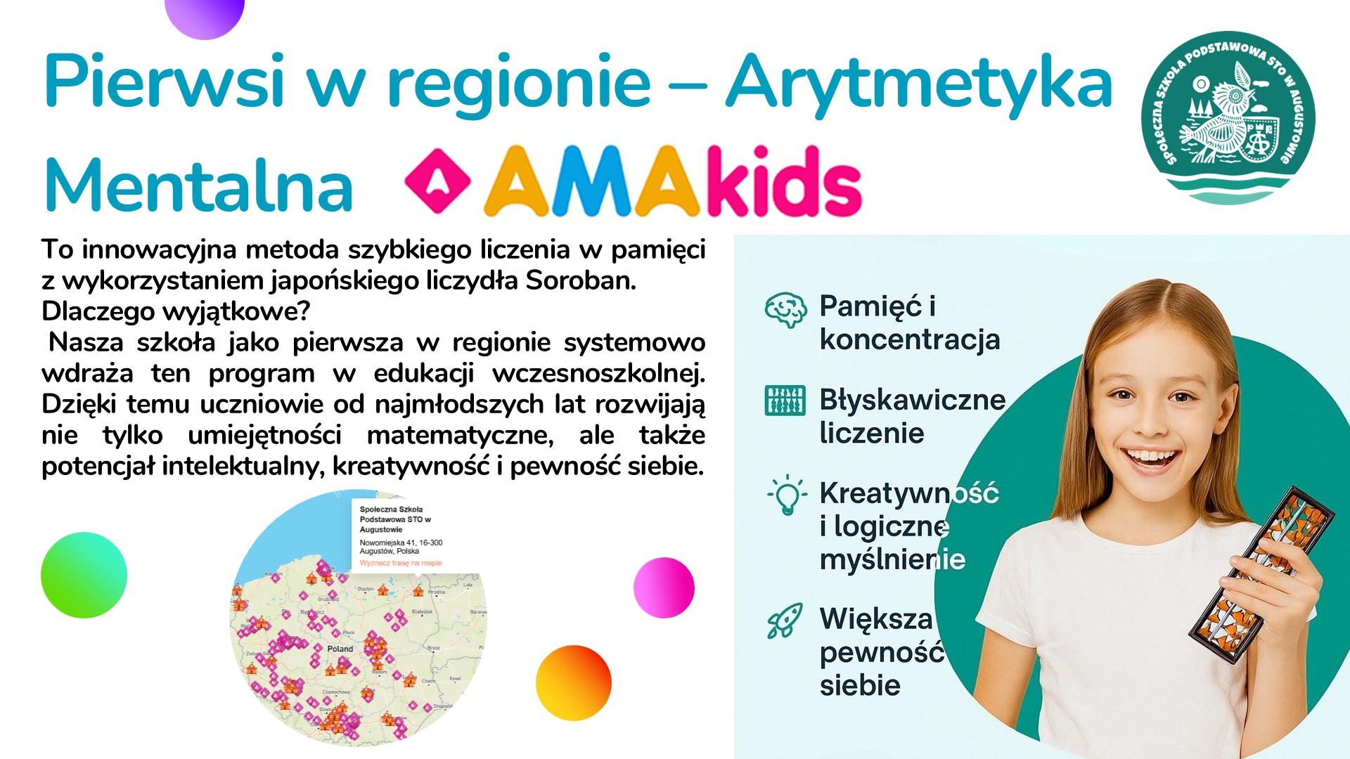 Społeczna Szkoła Podstawowa STO w Augustowie jako pierwsza szkoła w regionie wdrożyła program Arytmetyki Mentalnej AMAkids dla uczniów od zerówki do klasy 3. To innowacyjna metoda wspierająca rozwój intelektualny dzieci poprzez naukę szybkiego liczenia w pamięci z wykorzystaniem japońskiego liczydła Soroban. Na czym polega metoda? Zajęcia rozpoczynają się od pracy na fizycznym liczydle. Dzieci uczą się wykonywać działania matematyczne, przesuwając koraliki zgodnie z określonymi zasadami. Z czasem przechodzą na wyższy poziom — zaczynają wyobrażać sobie liczydło i wykonywać obliczenia w pamięci. Ten proces intensywnie angażuje obie półkule mózgowe, co wpływa na harmonijny rozwój dziecka. Jakie są efekty? Regularny trening arytmetyki (...) więcej